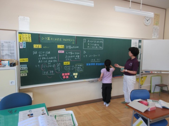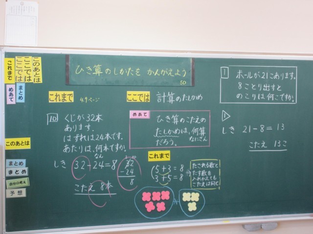 2年生は算数で引き算の筆算の学習に取り組んでいます。繰り下がりのある引き算で「答え」をたしかめるにはどうしたらよいかについて学んでいます。最初引き算の筆算で答えを出した後、先生から「その答え本当にそれであってる?」と声をかけられ、何とも言い様がなく困っていると、先生から「じゃあたしかめてみよう」と先生から促され、黒板の前でタイルを使って、まずは21-8=13をタイルで表してみてから、「もともとの数が21だから、13に引いた数8を戻してみよう」となって、戻した数がもとの21になっていることを確認しました。この後、引く数、引かれる数の学習をして、たし算でたしかめ算ができることを確認していきます。