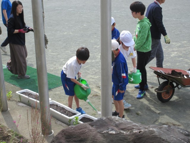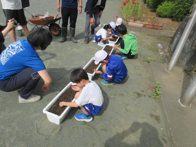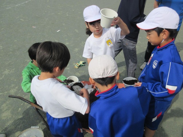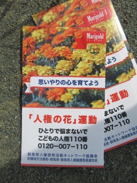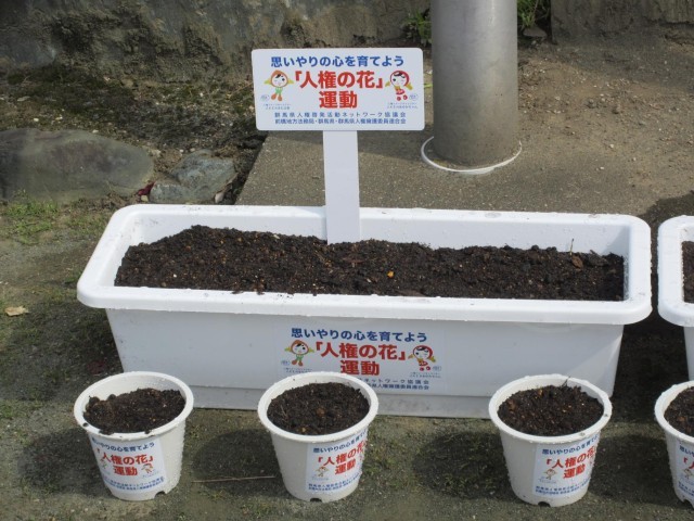 今日の業前は、人権擁護委員の方からいただいたマリーゴールドの種を、2・3・みかぼ学級の子どもたちがプランターに植える作業を行いました。業務員さんの教えてくれたことをよく聞いて、みんな張り切って作業をしました。ちょうど日野小学校では人権週間が始まっています。玄関の「人権の花」も子どもたちがした親切、された親切の花びらで咲き始めました。今日まいたマリーゴールドの種も、思いやりの心が育つように、きれいな花を咲かせてくれることでしょう。