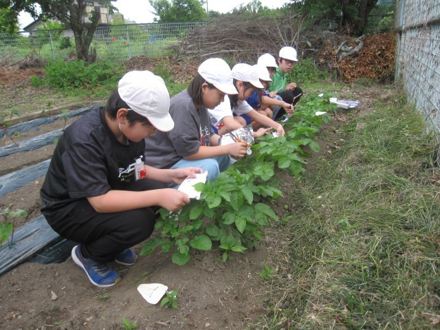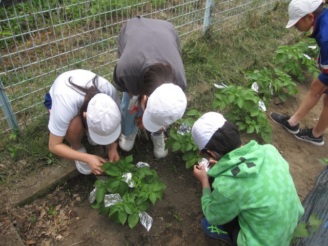 植物の葉に日光が当たるとでんぷんができるか調べる実験をセットしました。6月2日に結果を確認します。