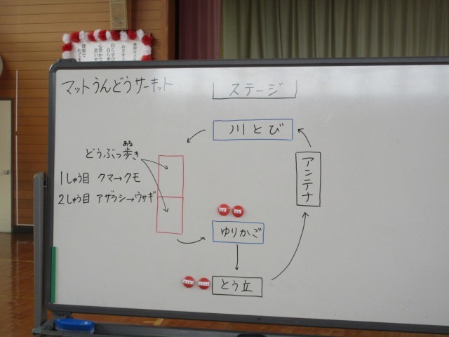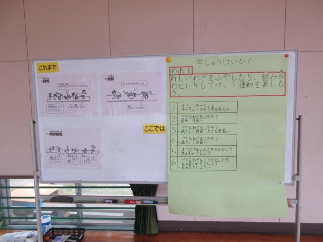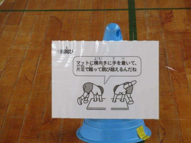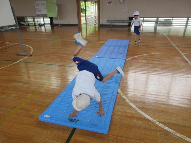 2・3年生は体育館でマット運動の学習に取り組んでいます。前転や後転の練習をするのですが、その前にウオーミングアップで、マットならしの運動を行っています。サーキット形式で時間で区切って様々な動きをしています。じっくり取り組んでいる子、何度も何度もやっている子様々です。楽しみながら運動に取り組んでいます。