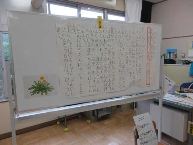 みかぼ学級では国語の学習に取り組んでいます。6年生は同じ部首を持つ漢字で、同じ音の漢字を調べています。調べるのに国語辞典を使って調べていますが、久しぶりに辞書を使うので使い方を再度先生と確認しながら進めています。「化 貨 花」など「化」を部首に持つ漢字を見つけて確認していました。3年生は「たんぽぽのちえ」の読み取りを進めています。先生が今日の天気を例に「雨降りの日は綿毛はどうなってる」との問いに「湿っている」「飛ばない」「だからすぼんでいる」というふうに答えていました。よく読み取りができています。