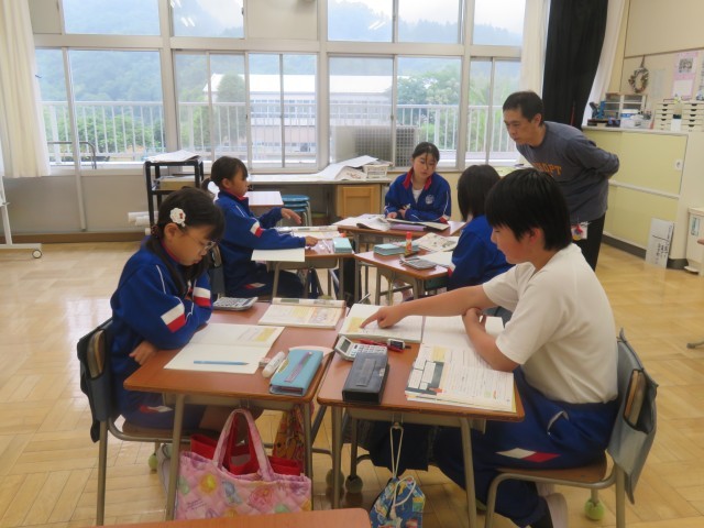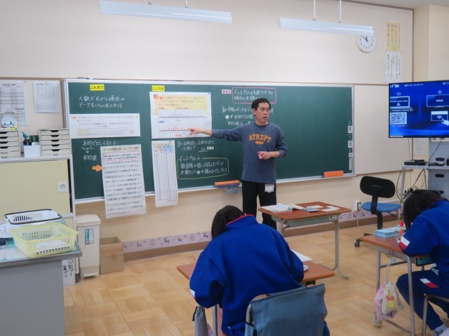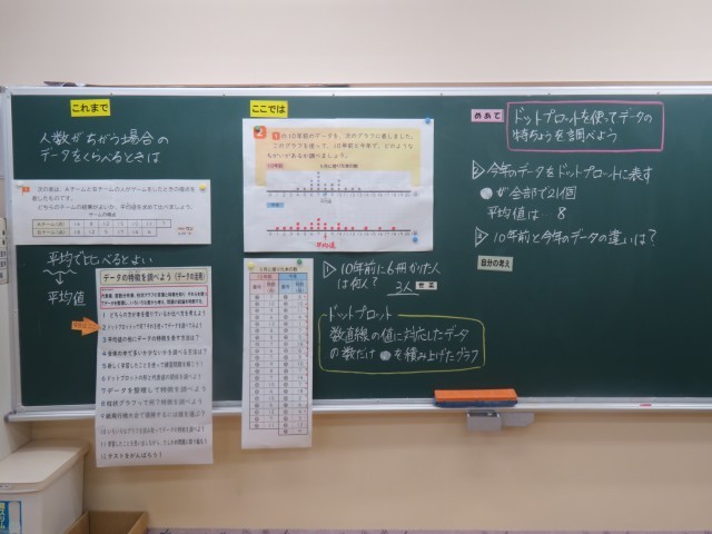 6年生は、ドットプロットを使ったデータの特徴について調べていました。10年前と今年のデータをドットプロットにし、それを比較して分かることを、まず、個人で考ました。その後、グループになって自分の考えを伝え合い、ドットプロットの特徴や読み方への理解を深めました。