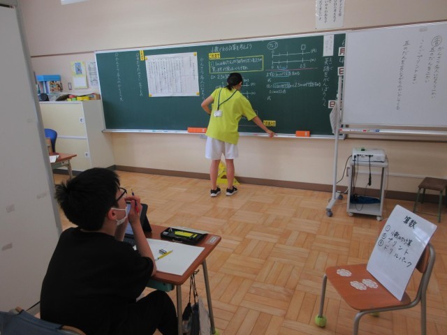 みかぼ学級では6年生が算数、3年生が国語の学習中です。6年生は小数のわり算の学習をしています。1m30円のリボンを2.3m買った代金について、30×2.3の計算をするのに、0.1mの代金を求めて23倍する方法で考えるときに、0.1mがいくらかを求めていきます。この考え方が、後の小数のわり算の考え方にいかされていきます。3年生は国語「かんさつ名人になろう」の学習中です。単元計画を子どもたちが確認し、見通しをもって学習できるようにしています。