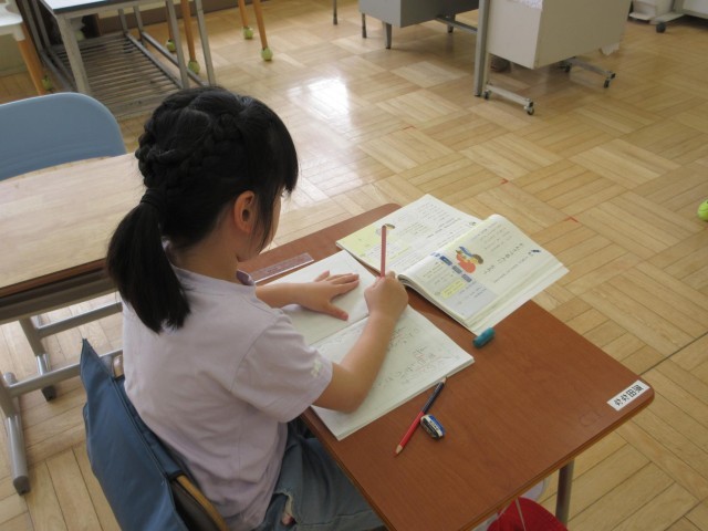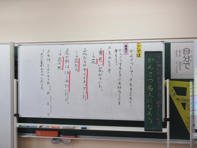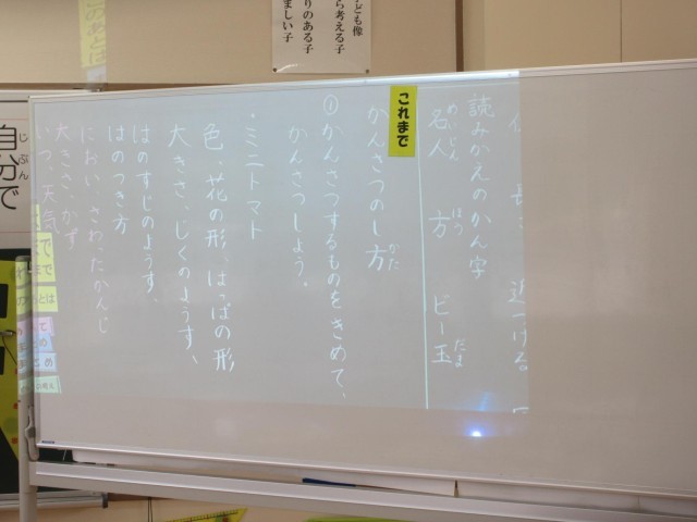 2年生は国語の「書く」活動の学習をしています。観察記録をつけるのに、どんな視点でどのように書いたらよいかを、教科書の例を読み取って項目ごとに分けて書く方法を学んでいました。早速この後は実際に育てている野菜の観察をしに行きました。