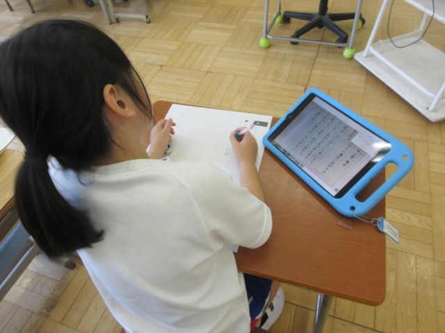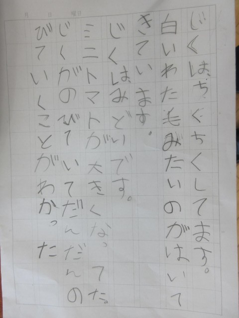 2年生は国語で観察記録を書く学習に取り組んでいます。育てているミニトマトの「じく」に興味を持って、じくの見た目や感触など、順序に気を付けて、メモをもとに観察記録を書こうとしています。日付を漢数字で書くなど、細かいところに気づいて書き始めました。どんな観察記録ができるか楽しみです。