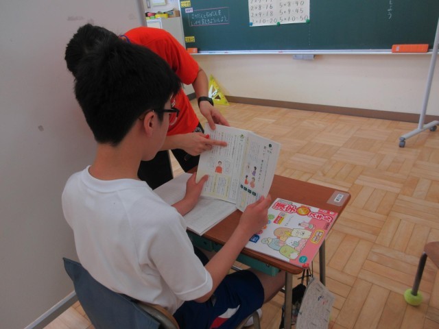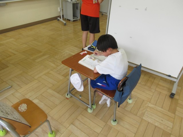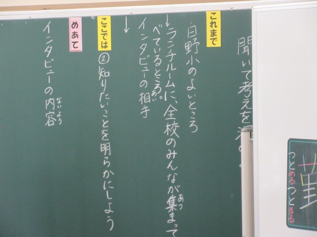 みかぼ学級では6年生が国語、3年生が算数の学習をしています。算数の九九の学習に入り、文章問題の式をたてるところから始めています。6年生はインタビューした内容をまとめる学習をしています。「日野小のよいところ」などをまとめるようで、まずは自分で思うよいところを「みんなで一緒に給食を食べられるところ」と答えていました。どんなレポートができるか楽しみです。