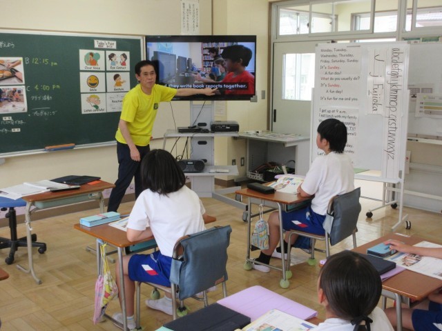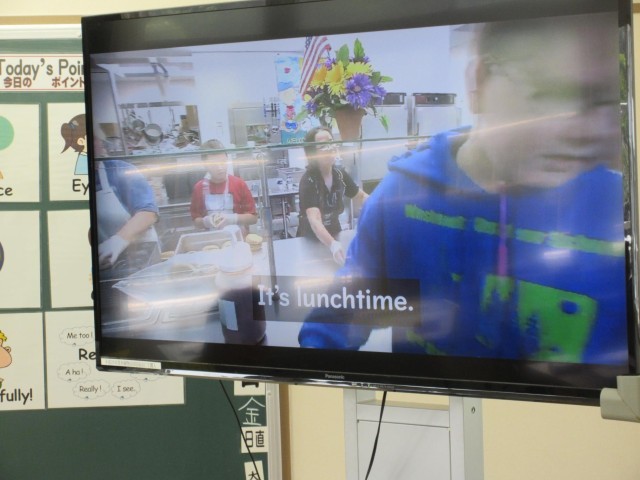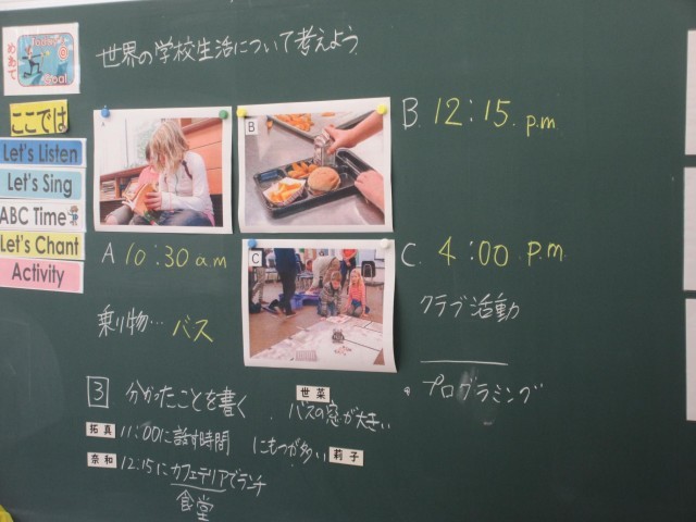 6年生は英語の学習中です。今日は、自分たちで作った「1日の過ごし方」と、アメリカの小学生の一日の過ごし方を比較しています。討論の時間があったり、ランチルームで一人一人がおかずを取っていったりするなど、日本の学校とは違う様子を、英語を介して興味深そうに比べていました。
