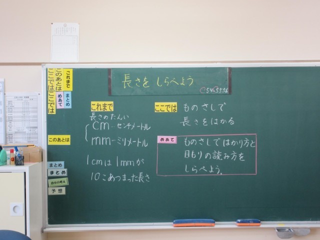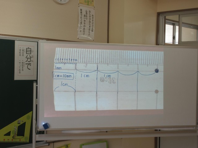 2年生は算数で30㎝物差しを使った長さを測る学習に取り組んでいます。今日は、物差しの区切り線がいくつあるかや1㎝、1mmの単位など、物差しからわかることを物差しを見ながら学んでいます。新しい学習で興味津々で学んでいます。