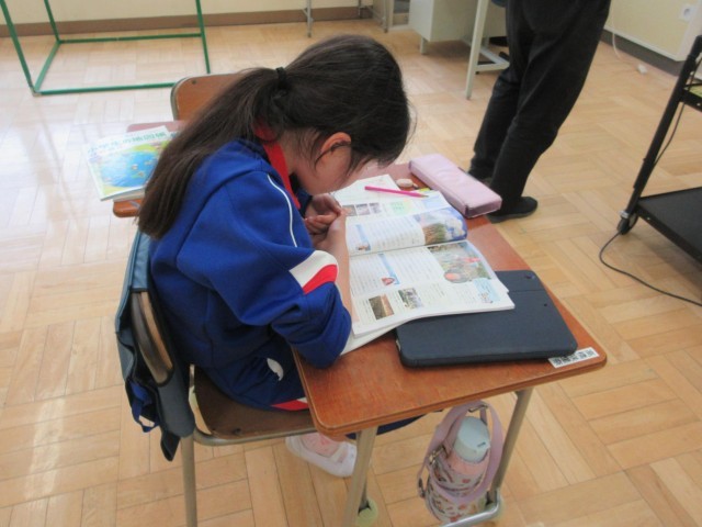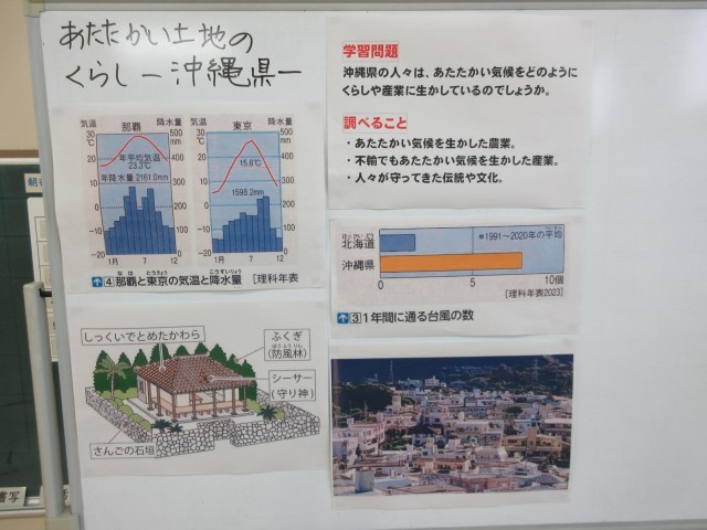 5年生は社会科で、沖縄に暮らす人々の生活について学んでいます。今日はサトウキビ農家の人の生活や工夫について調べています。調べていく中で、倒れているサトウキビと束ねてあるサトウキビの写真について、どうして倒れたのかを考えていました。沖縄地方の気候で台風が多いことをヒントに風で倒れていることや、倒れないように束ねておくことなどを確認していました。