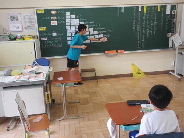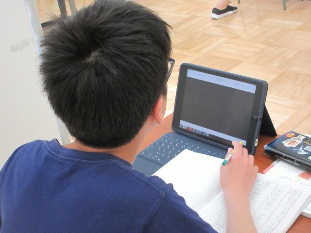 みかぼ学級では6年生が国語で「インタビューをしよう」の学習に取り組んでいます。タブレットを使って、事前に先生が入力しておいたインタビューの見本を聞きながら、自分でもインタビューする準備を進めています。3年生は4の段のかけ算に入りました。4のかたまりの図を使って、1つずつ4のかたまりが増えていくことを確認しています。