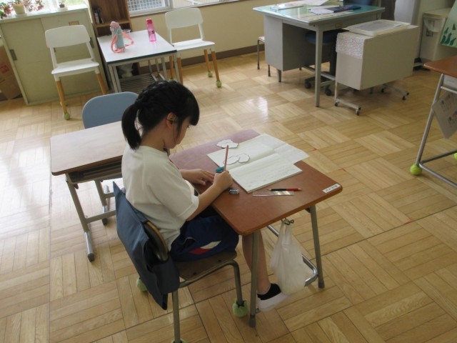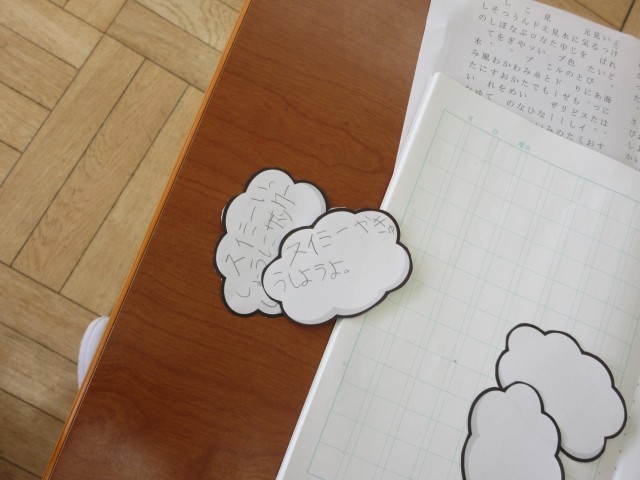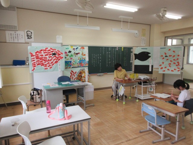2年生は国語「スイミー」の読み取りに取り組んでいます。今日は、ひとりぼっちのスイミーが、海の仲間たちと出会って元気を取り戻していく様子の読み取りをしています。海の仲間たちになりきって、スイミーにどんな声をかけるのかを考えています。「一緒に宝探しをしよう」と書いて発表していました。先生も、子ども役になって一緒に考えています。