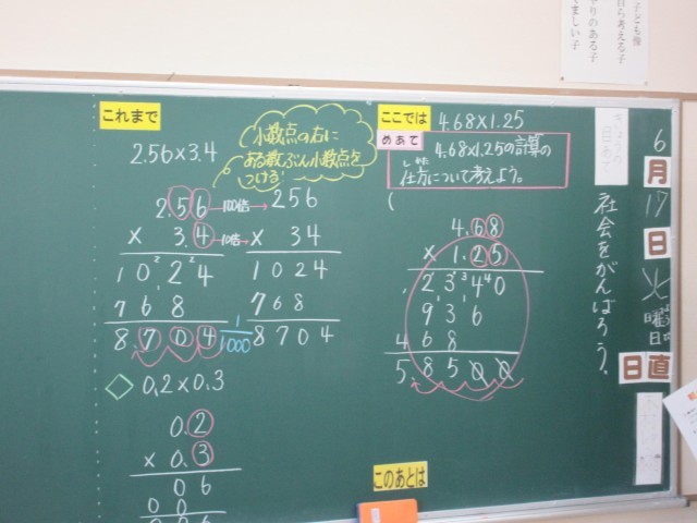 みかぼ学級では6年生が算数の小数のかけ算の学習をしています。小数第2位までの数同士のかけ算で小数点をどのように動かすかを学習していました。先生といっしょに学習した後に、練習問題に取り組んでいます。