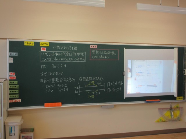 5年生は算数で小数のわり算の学習をしています。96÷2.4の計算をどのようにして求めたらよいかについて考えて、96÷24にして答えを出してみました。そうすると答えが4になったので、先生から数直線をつかって、「答えを10倍すれば出せる」ことをたしかめて、40と答えることができていました。他にもどのような考え方ができるか学習を進めています。