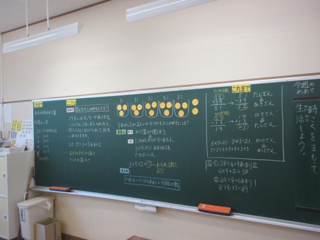 3年生は算数で、あまりのあるわり算のたしかめ算の学習をしています。最初にこれまでの学習で、あまりの数がわる数よりも小さくなることを確認した後、かけ算が使えそうだとの見通しを立て、実際に計算してみました。そこで今一度つなぎ教材としての「これまで」の学習で、たしざんと引き算のたしかめ算の考え方が出てきました。それをもとに実際にかけ算でたしかめ算をしたところ、答えが合うことがわかりました。