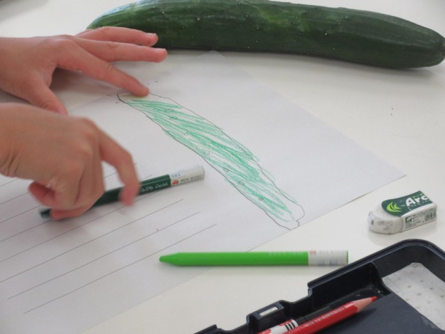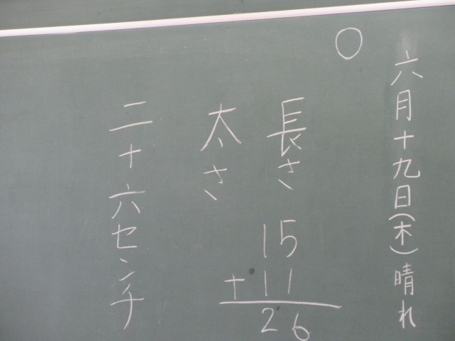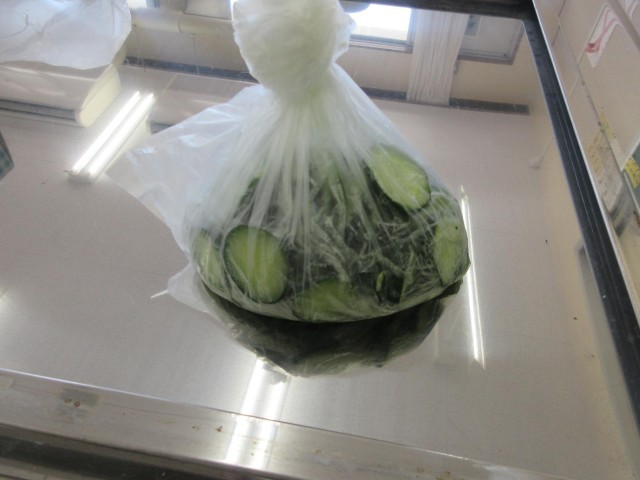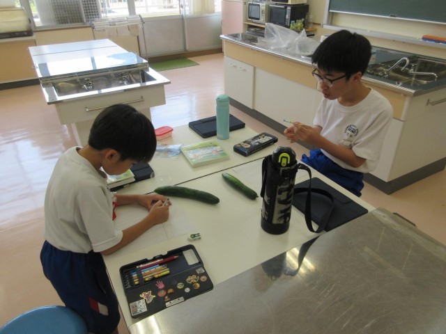 みかぼ学級では、学校園でとれたキュウリを使って自立活動の学習が行われていました。キュウリを収穫して、観察記録をつけたり、実際にキュウリもみをつくったりしています。観察記録を書くところで、早速算数や理科で学習してきた長さや太さに着目することを確認していました。キュウリもみは冷蔵庫に入れて塩をしみこませています。