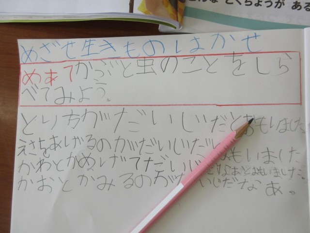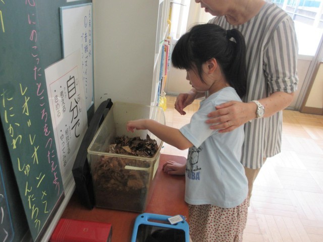2年生の教室では、飼育しているカブトムシのさなぎが、もぞもぞ動いているのを子どもが発見し先生に報告しました。早速、図書館でどれぐらいで生まれるのか、生まれたらどうすればよいのかを調べていました。「めざせ生きものはかせ」をテーマにカブトムシのことをいっしょうけんめい調べています。この土日に生まれるかもしれないので準備に大忙しです。