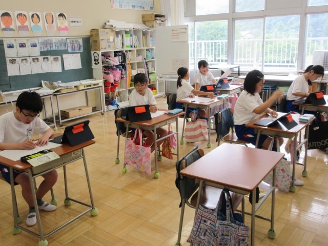 56年生は図工の学習で「人権ポスター」作りに取り組んでいます。キーワードをみんなで出し合い、タブレットでいろいろな作品を見た後、どんなポスターを描こうか構想を立てて下書きを始めています。どんなポスターができるでしょうか。「思い」を大切に描いてほしいです。