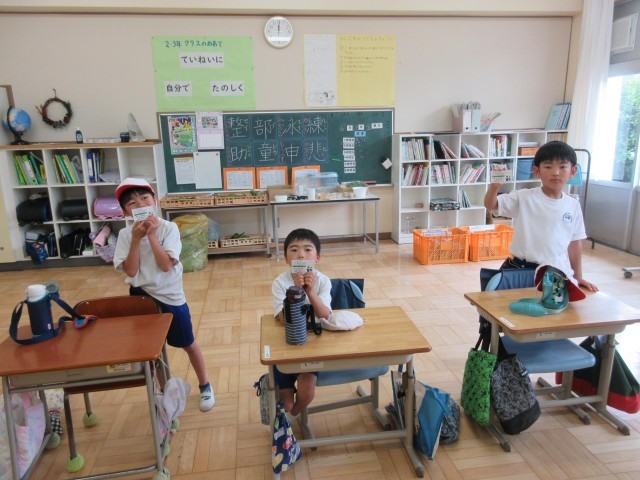 3年生は平井小学校と合同で、かぶら自動車教習所で行われた「自転車乗り方教室」に参加してきました。安全な乗り方について説明を受けた後、いよいよ実際に自転車に乗って正しい乗り方を学びます。最後は、自転車に乗ってもよいという許可書をいただきうれしそうでした。