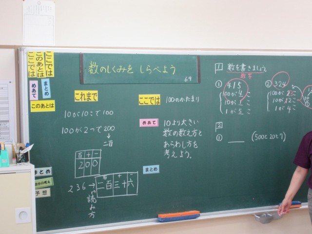 2年生は算数で100より大きな数について学習しています。「426」が100が4つ、10が2つ、1が6つ、というふうに数の構成から学習しています。その中で824の百のくらいの読み方を「はっぴゃく」というふうに読むことを教わっていました。まだまだ学習が始まったばかりなので、丁寧に学習を進めています。