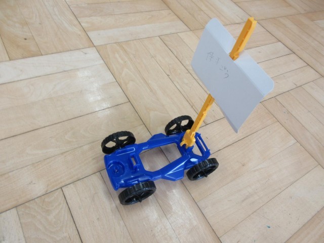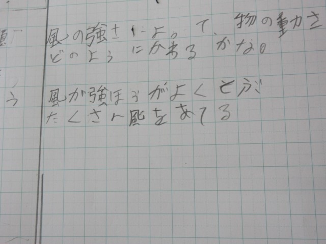 3年生は理科で「風の強さとものの動き」の学習をしています。今日は、風を受けて走る車がよく走るにはどうしたらよいのか予想をたててたしかめようとしています。子どもたちは、「風が強ければよく走る」と予想をたてました。そこで、団扇を仰ぐのに、2枚にしたらよく走るのでは、とか近くで扇げば速く走るのでは、などなどいりいろなことを試しながら、風の強さとものの動きをたしかめていました。授業を見ていると、車を自分たちで組み立てたことを自慢げに話してくれました。
