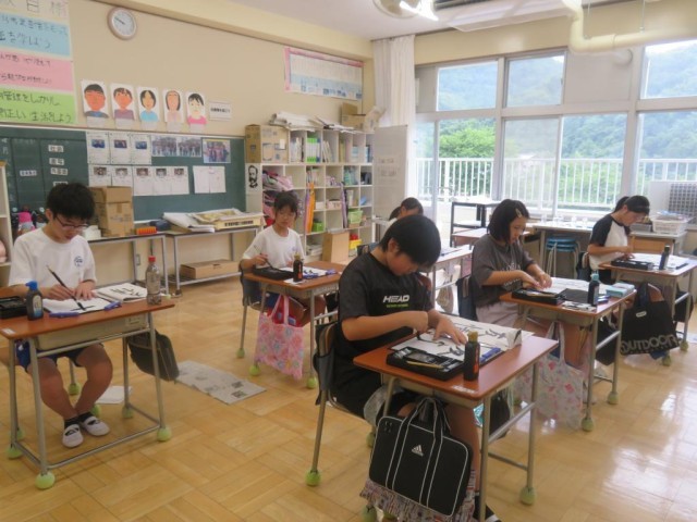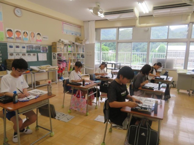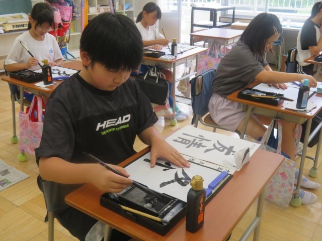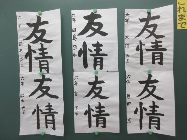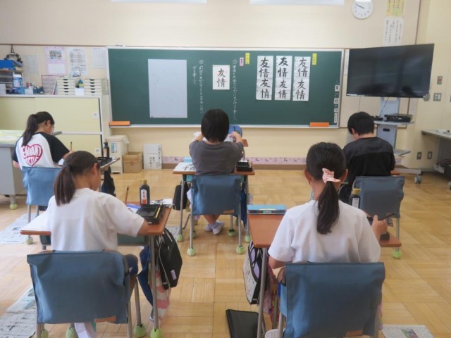 6年生は書写で「友情」という漢字を毛筆で書く学習をしています。特に点画のつながりに気を付けて書いていました。字は個性が表れると言います。それぞれ丁寧に書くことができました。