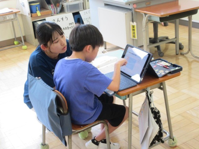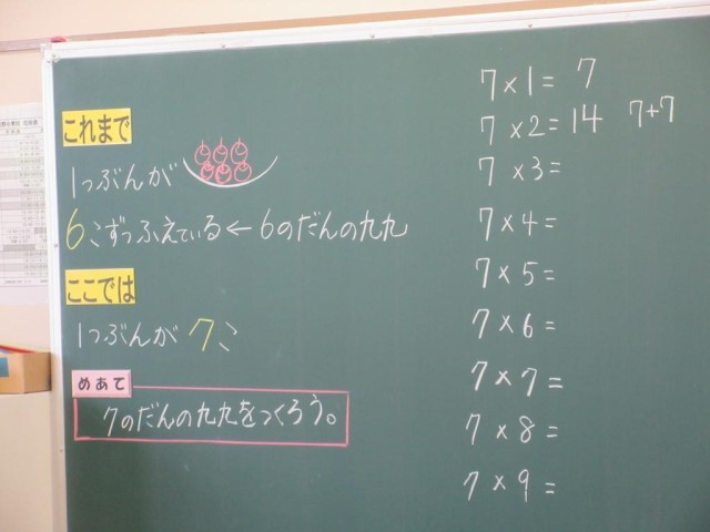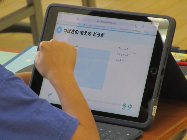 みかぼ学級では算数で、かけ算九九の学習が進んでいます。今日は7の段の学習をしています。タブレットを使って、7のかたまりが何個ずつ増えているか、実際に数えながら学習を進めています。「いくつずつ増えている」という先生の問いに、実際に数を数えて、「7個ずつ」と答えていました。子どもの実態に合わせじっくりと学習が進んでいます。