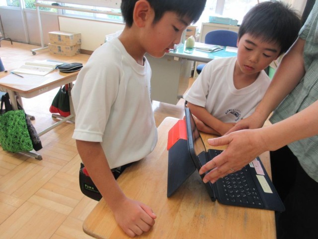 3年生は国語の学習で、職業について調べる方法を考えています。実際にインタビューしてみようという話になり、先生から「もしインタビューで実際に会えないときはどうする」という問いかけに、しばらく考えてから「メール」「電話」などの意見が出されました。そこで先生から「タブレットを使ってできないかな」という問いがあり、実際にclassroomをつかって先生や友だちとやり取りする方法を思いついていました。これから実際にインタビューする活動が始まります。