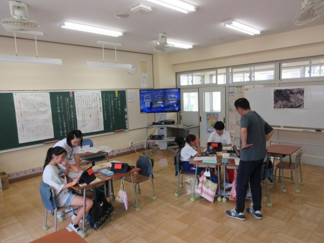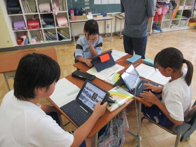 6年生は国語の学習で「デジタル機器」をテーマにした提案文を作っています。「ネット詐欺」や「イヤホンの使いすぎによる聴力低下」など子どもたちが身近に見聞きしたり、実際に体験したりしたものの中からテーマを決めて、インターネットで調べたり、実体験で感じたことを書いやりして、文章にまとめていきます。今の子どもたちにとっても関心のある社会課題でもあるので、集中して取り組んでいます。