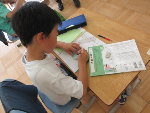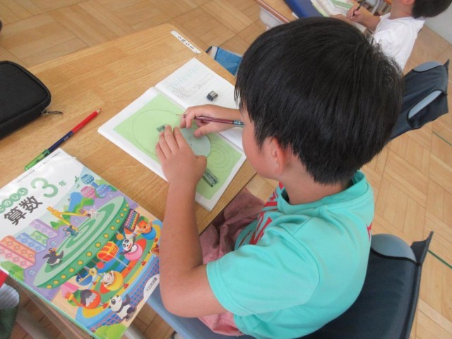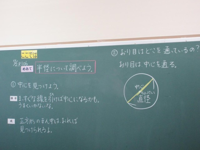 3年生は算数の「円」の学習を進めています。今日はこれまで学習した「半径」のことをもとに、「直径」について学んでいます。円の中心を通り円の恥から恥までを結んだ線のことを学習するのに、まずは切り取った円を中心でいくつも折ってみて、出来上がった線にどんな特徴があるのかを探しています。中心を通ること、半径の2倍の長さになっていることなどを実際にたしかめていきます。先生から「直径って1つの円にいくつあるんだろう」という問いかけにしばらく悩んでいましたが、「数え切れないくらいある」という意見が出て、子どもたちは納得している様子でした。