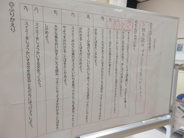みかぼ学級では6年生が「楽しみは」という書き出しで「短歌」を作る学習に取り組んでいます。まずは、単元に出てくる新出漢字を練習しています。3年生はスイミーの読み取りを進めています。スイミーの仲間で真っ黒な生き物について紗遠征から尋ねられ、前回自分で探し出した「カラスガイ」がきっと仲間だと答えていました。この単元でどのように学習するか一覧になって白板に掲示されていて、達成できたら花丸をつけるようになっています。