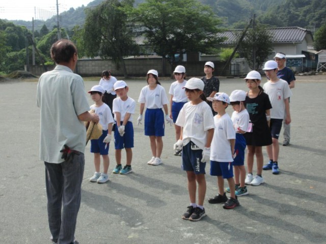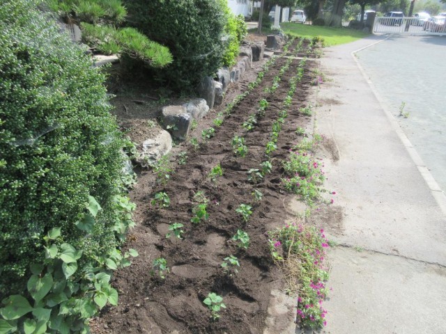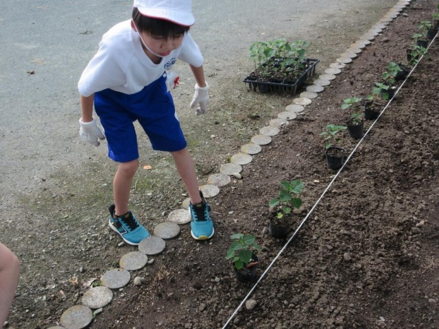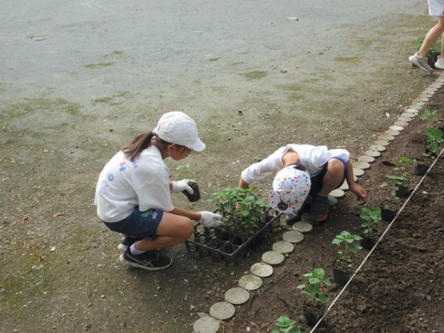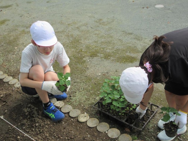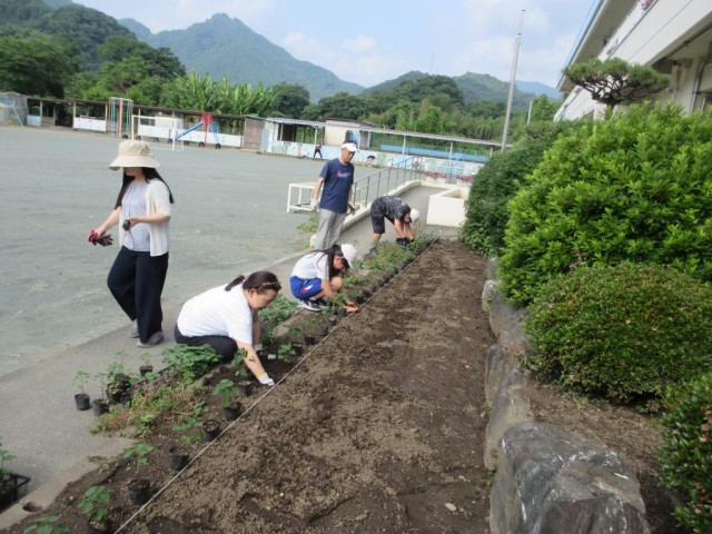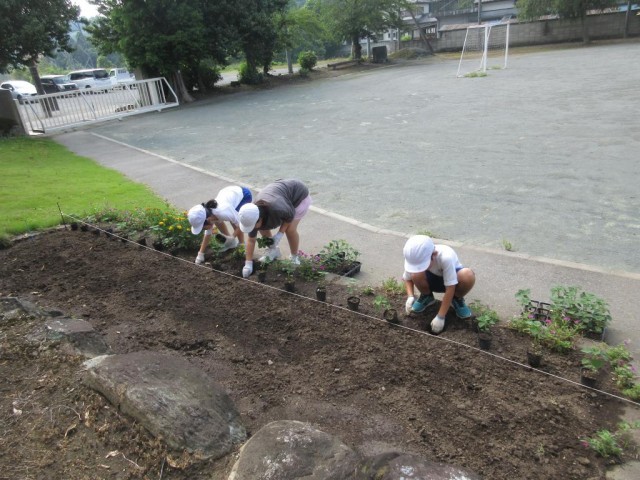 今日の業前は「花の学び舎づくり」でサルビアの苗を植えました。業務員さんが育ててくれたサルビアの苗を、団別活動で全員で植えました。暑い中朝を書きながらみんな一生懸命作業したおかげで、花壇にサルビアの苗を植え終わりました。6年生は学期末に、お世話になっている日野地区の施設に、プランターに植えたサルビアの苗を直接私にいく予定です。きっときれいな赤い花を咲かせてくれることでしょう。