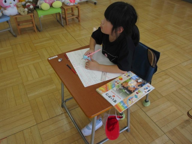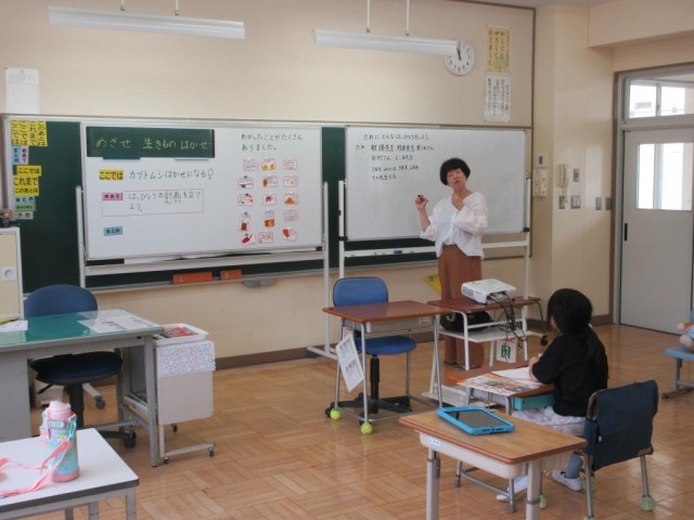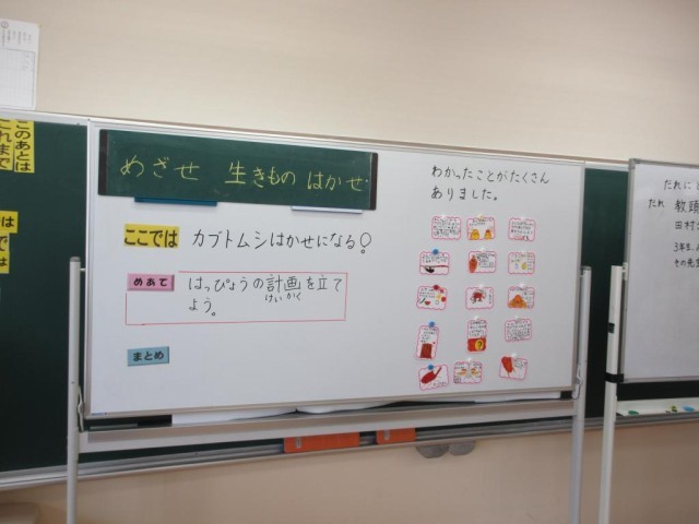 2年生は生活科の学習で「カブト虫博士になろう」というテーマで、カブト虫の飼育や観察をしてわかったことをまとめています。今日は発表する計画を先生といっしょに立てていました。学期末の発表、とても楽しみにしています。