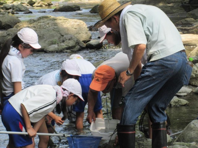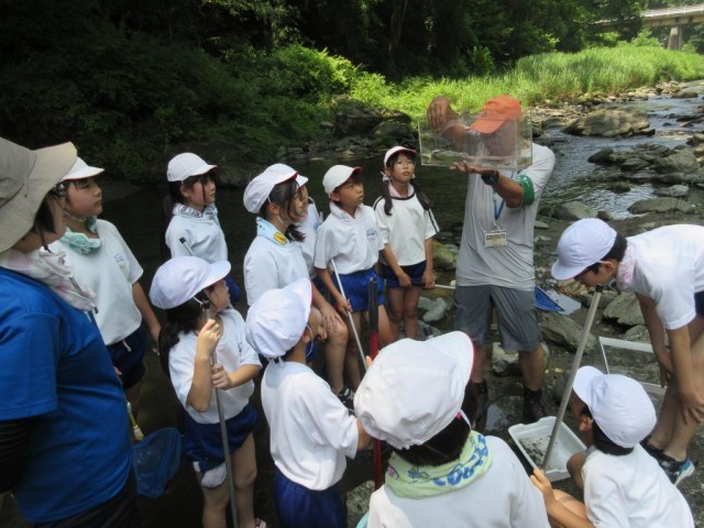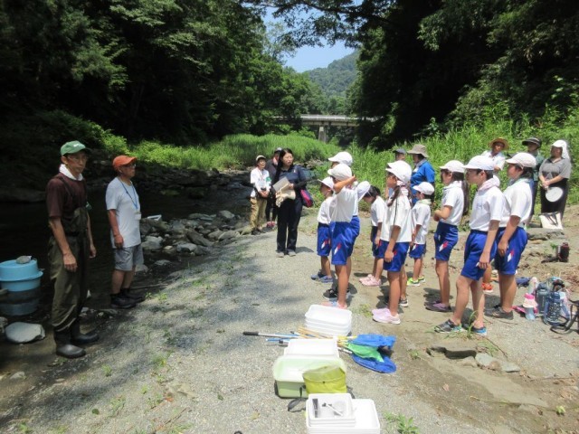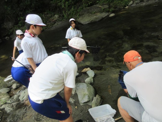 今日の34校時は、フォレストリースクールで近くの川の水生生物を捕まえ観察する学習を行いました。県の林政課の事業として実施していただき、2名の講師の方の指導のもと、まずは水生生物を捕まえるところから、川虫や魚を捕まえ、濡れるのも構わず夢中になって探しまくりました。その後講師の先生から捕まえた生き物の解説をしていただき、「水がきれいなところに育つ虫や魚が多い」「みんなが大人になってもきれいな川で生物を捕まえたことは覚えているはず」「自分が中学生以来捕まえてことがなかった魚がいてびっくりした」「みんないいところに住んでいるね」などのお話しをいただきました。子どもたちにとっても貴重な体験となりました。講師の先生方、県林政課の皆様、ありがとうございました。