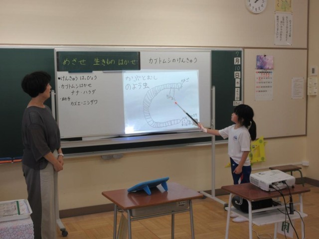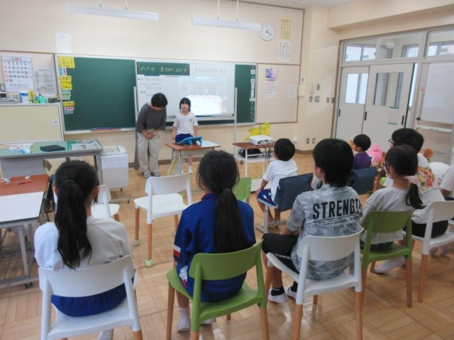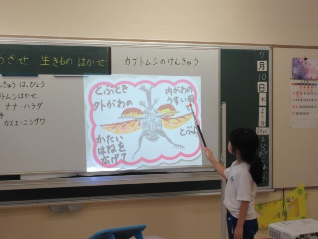 2年生が生活科で学習した「めざせ生きものはかせ」の学習成果を発表してくれました。カブト虫を飼育して、観察したことをもとに本やインターネットで調べてその成果をクイズを入れながら発表してくれました。カブト虫の寝方やクワガタとの寿命の違い、お尻の特徴など知らなかったことがいっぱいあってみんな楽しく発表を聞くことができました。「生きものはかせ」になることができた2年生、がんばりました。