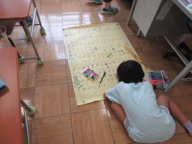 トマト農家さんの見学をして、初めて知ったことや驚いたことを、学校のみんなに発信するため、模造紙にまとめています。読む人にとって初めて知ることになるであろう記事については、見出しを工夫して書いたり、クイズコーナーを設けて読む人を楽しませようとしたり、たくさん工夫をしながら楽しんで取り組んでいます。仕上がりが楽しみです。