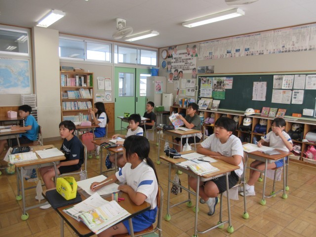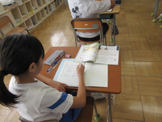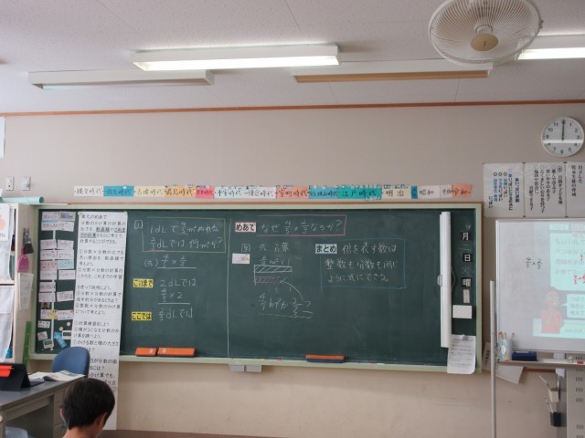 2学期最初の算数の学習は「分数のかけ算」です。どんな学習を行う単元なのか、計画をもとに学習の見通しを持ちました。本時の課題を読み、図などを使って、自分なりに解くことから始めました。どのようにすれば解けるのか、仲間の考えを聞いて考えを深める姿も見られました。