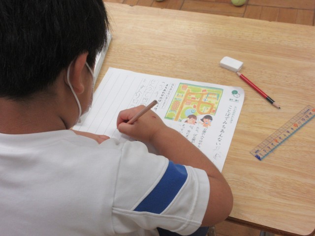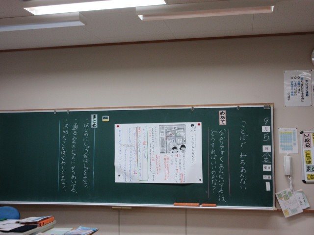 「ことばでみちあんない」の学習で「わかりやすくあんないするためにはどうすればよいのか」をめあてに学習しました。一つの地図をもとにして、目的地までの案内文を考えることは簡単そうで、子供たちにとって、なかなか難しいようです。目安となる建物などに目を向け、方向を表す言葉を活用しながら、わかりやすい案内になるよう考えを深めていました。