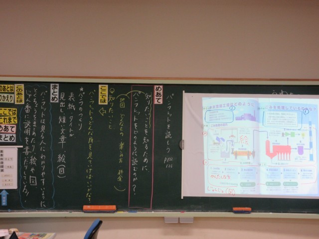 「知りたいことを知るためには、パンフレットをどのようにみるか」をめあてに学習を進めました。めあてを達成するために着目したことは、パンフレットがどのように構成されているかです。図を使ったり、短い文で説明文を加えたり、読み手にとってわかりやすくまとめられていることに子供たちは気付くことができました。