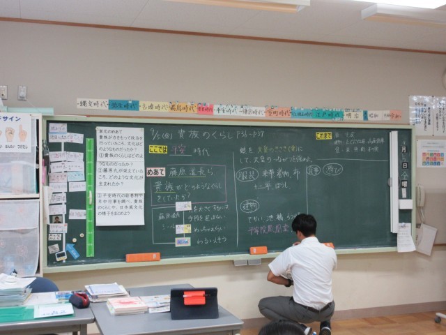 「貴族の暮らし」の学習で、「藤原道長ら貴族はどのような暮らしをしていたのか」をめあてに学習しました。教科書や資料集の絵や写真をもとに、気付いたことを出し合い、平安時代の貴族はどのような暮らしをしていたのか理解することができました。