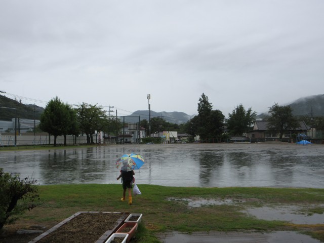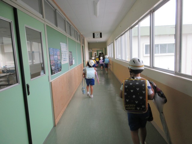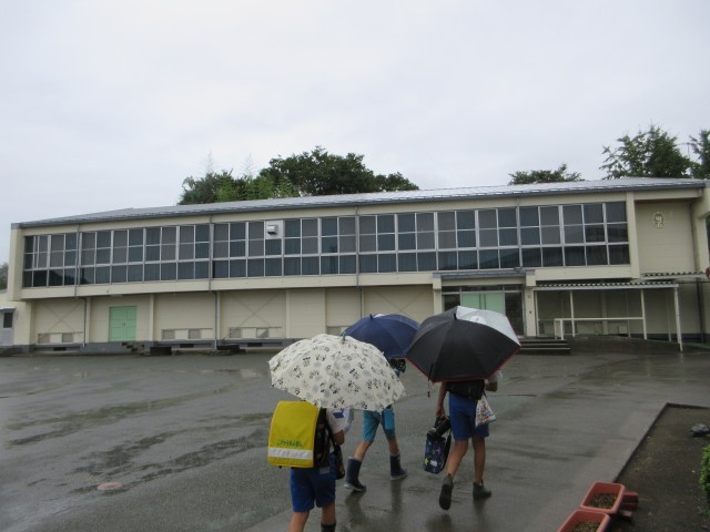 台風の影響で,朝から雨が降り続いた1日でした。家が近い子供たちは歩いて帰ったり,距離がある子供たちは車で送迎してもらったりしています。また,学童に通う子供たちも多く,こういう雨の日は校舎内を移動して併設されている学童の部屋まで行くことができます。全員が無事に下校しました。