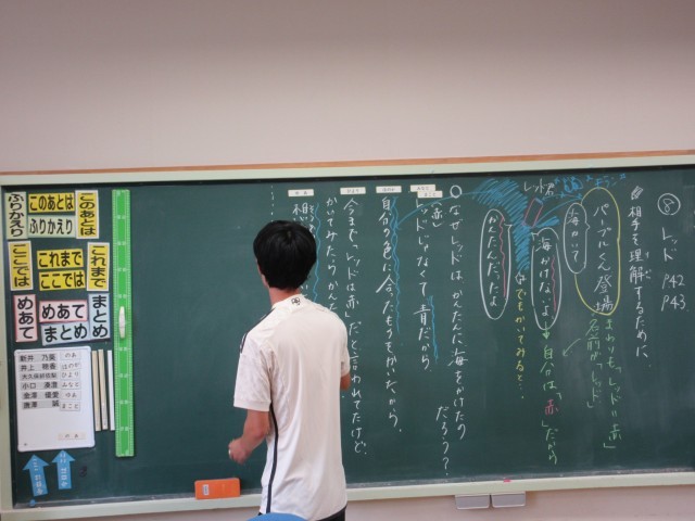 「相手を理解するために」をめあてに学習を行いました。「レッド~あかくてあおいクレヨンのはなし~」という教科書のお話をもとに「相手のことを決めつけずに立場をよく見て、聞いて、考えることの大切さ」について学習しました。「レッド」と言われると「赤」と思い込んでしまいますが、「レッド」という名前の青色を描くことができるクレヨンの話です。なんだか不思議な話ですが、子供たちは、自分たちの思い込みで、相手を決めつけることは望ましいことではないなどの意見を述べ合うことで、考えを深めることができました。