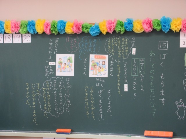「あいてのきもちになって」をめあてに、お話の登場人物の気持ちを考えることを通して、親切にすることのよさをみんなで考えました。親切にすると、親切にされた人みんなも笑顔になるし、親切にした本人もとってもいい気持ちになると考えることができました。