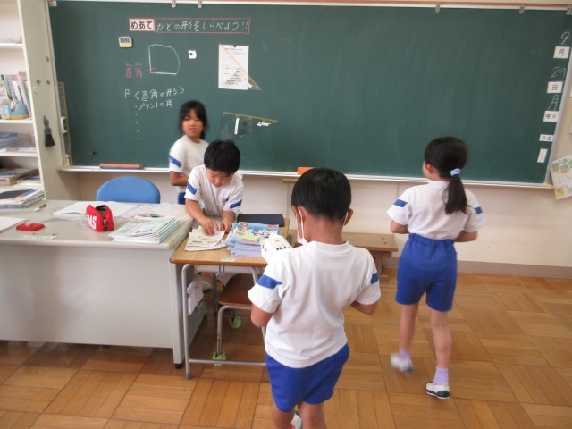 これまでに「直角」を学習しました。教室を見渡すと,角が「直角」になっているものが多そうです。三角定規の90°の角を当てて,角が「直角」のものを調べます。プリント,黒板,箱,本,など,身の回りには角が「直角」のものがたくさんあることが分かりました。「直角」をもつ形の勉強を進めていきます。