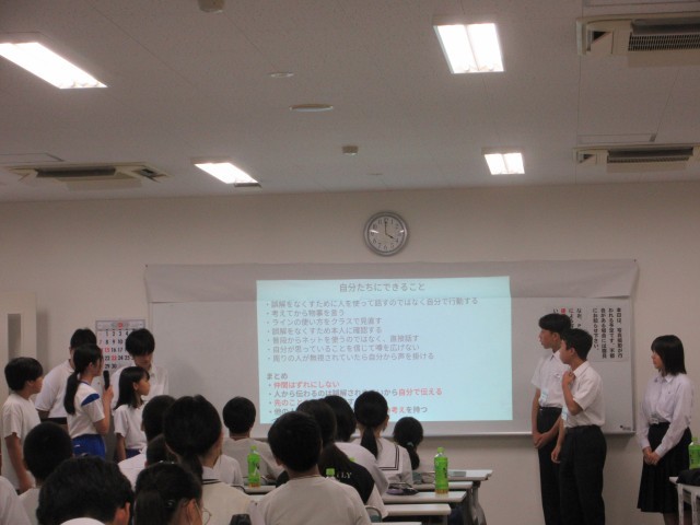 「あなたと私が認め合ってつくる未来~かけがえのない友達と自分を思いやり,私たちが考える責任ある行動~」をテーマに,藤岡北高校の生徒から基調提案があり,班別協議が行われ,「自分たちにできること」を発表し共有しました。高校生のリーダーシップのもとで学年を交えて活発な意見交流ができました。協議したことは代表児童から鬼石北小のみんなに伝えられ,できることから取り組んでいきたいと思います。