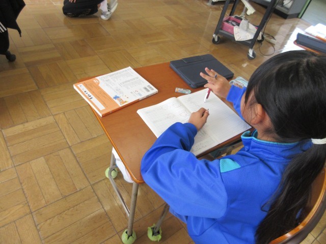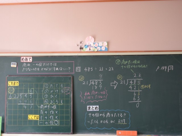 「商が一の位だけで足りないときは、どうすればよいか」を考えることをめあてに学習しました。これまでの学習は、商を一の位にたてることだったので、今日の問題も同じように解いてみると、あまりが割られる数より大きくなることに気づき、どうすればよいかを考えました。自分なりに考えをもった後、その考えを共有することで、正確に問題を解くためのやり方を理解することができました。