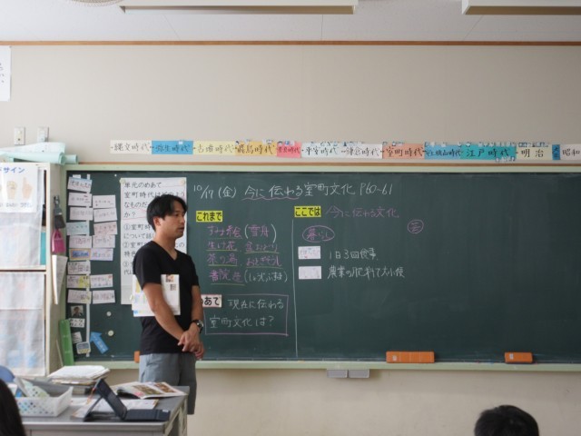 「今に伝わる室町文化」の学習で、本時は、「現在に伝わる室町文化は?」をめあてに学習しました。教科書や資料集をもとに、室町時代の文化について読み取りました。「暮らし」について考えたとき、食の文化において、室町時代と現代に共通することが多くあることに、子供たちは気付き驚いた様子が印象的でした。