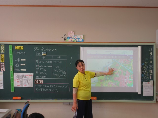 中村堰の学習を進めています。今日のめあては「中村堰ができて、人々のくらしはどう変わったのか」について考えることでした。まずは、中村堰について、昔と今の違いについて比べ表にまとめました。表にまとめた事実をもとに、人々の暮らしを関連付けて考え、暮らしの変化について考えを深めました。