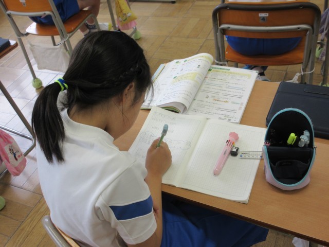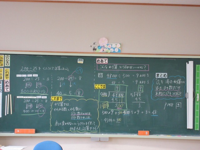 「4800÷500」のようなわり算をするとき、どのような計算の工夫ができるのか、また、このような計算のときに、あまりはどうなるのかを考えました。「48÷5」と考え方は同じでも、確かめ算をすることで、あまりは同じではないことに子どもたちは気付くことができました。