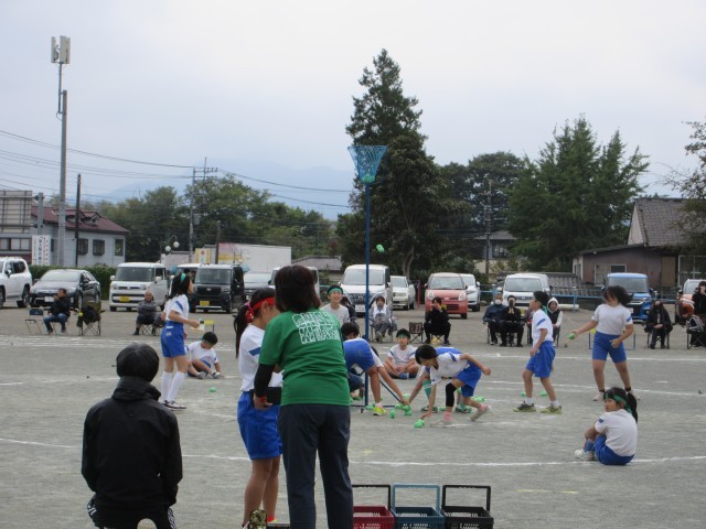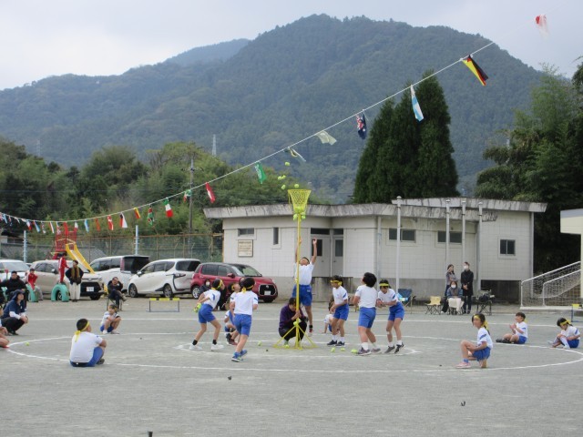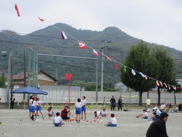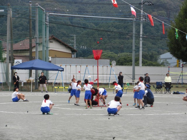 そして,いよいよ本戦は,玉入れの途中に「○○」とお題が出ます。そのお題をクリアしてまた玉入れに戻ります。1~3年生も,4~6年生も,お題もさっとクリアして上手に球を入れていました。