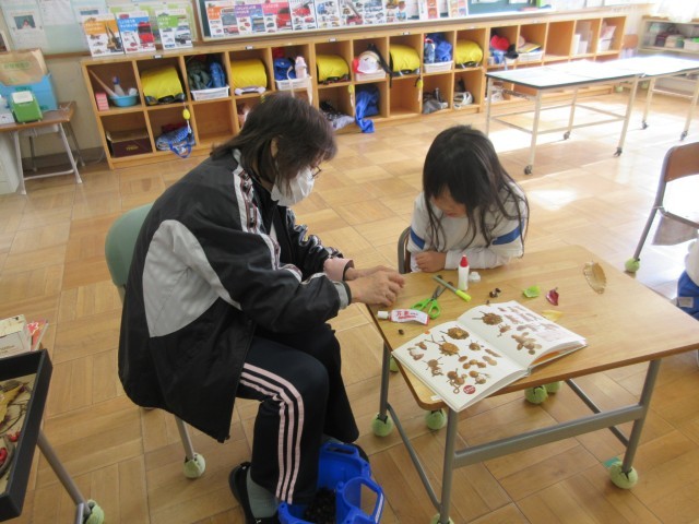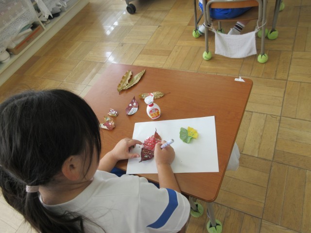先日、群馬の森で、色づいた葉っぱやどんぐり、松ぼっくりをたくさん拾ってきました。秋の物を使って、楽しく遊べる物を作成中です。葉っぱに顔を描いたり、箱にどんぐりを貼り付けたり、とっても楽しそうに活動していました。